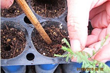 コンテナ苗は「根鉢付き苗」であるうえ、根鉢が小さく細長いので植栽が簡単です。特に土壌が膨軟で水分条件の良いほとんどの林地に植栽する場合は、根鉢の形状をした小孔をつくり、そこに苗をはめ込むだけの非常に簡易な作業に効率化することができます。